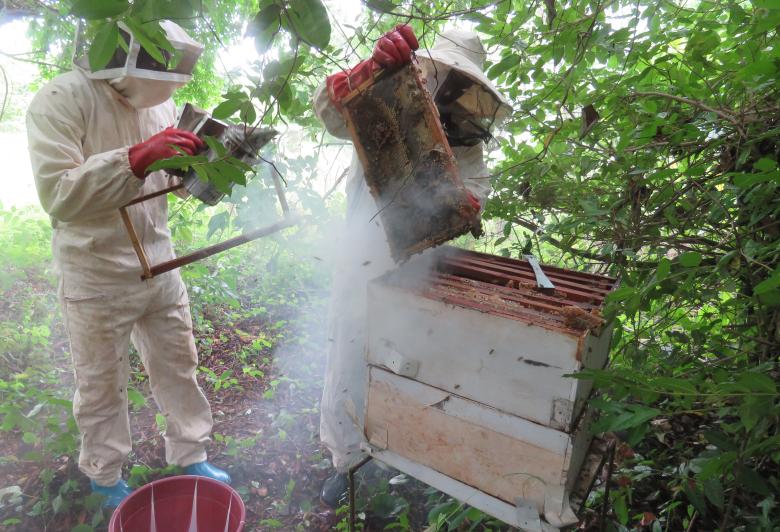 In der Unterpräfektur Kolenté sind weite Flächen von sattgrünen Wäldern bedeckt. Diese sind weitgehend unberührt. Dieser naturnahe Lebensraum bietet ideale Bedingungen für die Entwicklung der Imkerei. Verschiedene Gruppierungen widmen sich bereits der Honiggewinnung, jedoch mit rudimentären Mitteln und Kenntnissen: Sie plündern die Nester von Wildbienen oder ernten den Honig aus kurzlebigen Bienenkörben. Eine Frau aus dem Dorf Kinsanya, die bereits von einem früheren Imkerei-Projekt profitieren konnte, erzählt: «Früher machte ich mich allein und desorganisiert auf Honigsuche. Mein Mann und ich fällten zusammen Bäume und zerstörten ganze Bienenvölker, ohne uns dessen bewusst zu sein. Heute gehe ich völlig anders vor. Unsere Handwerker wurden sogar in der Herstellung von Bienenstöcken geschult. Die erste Ernte war für mich ein echter Wendepunkt. Das Ergebnis sprach für sich und hat mich von der Wirksamkeit überzeugt.»